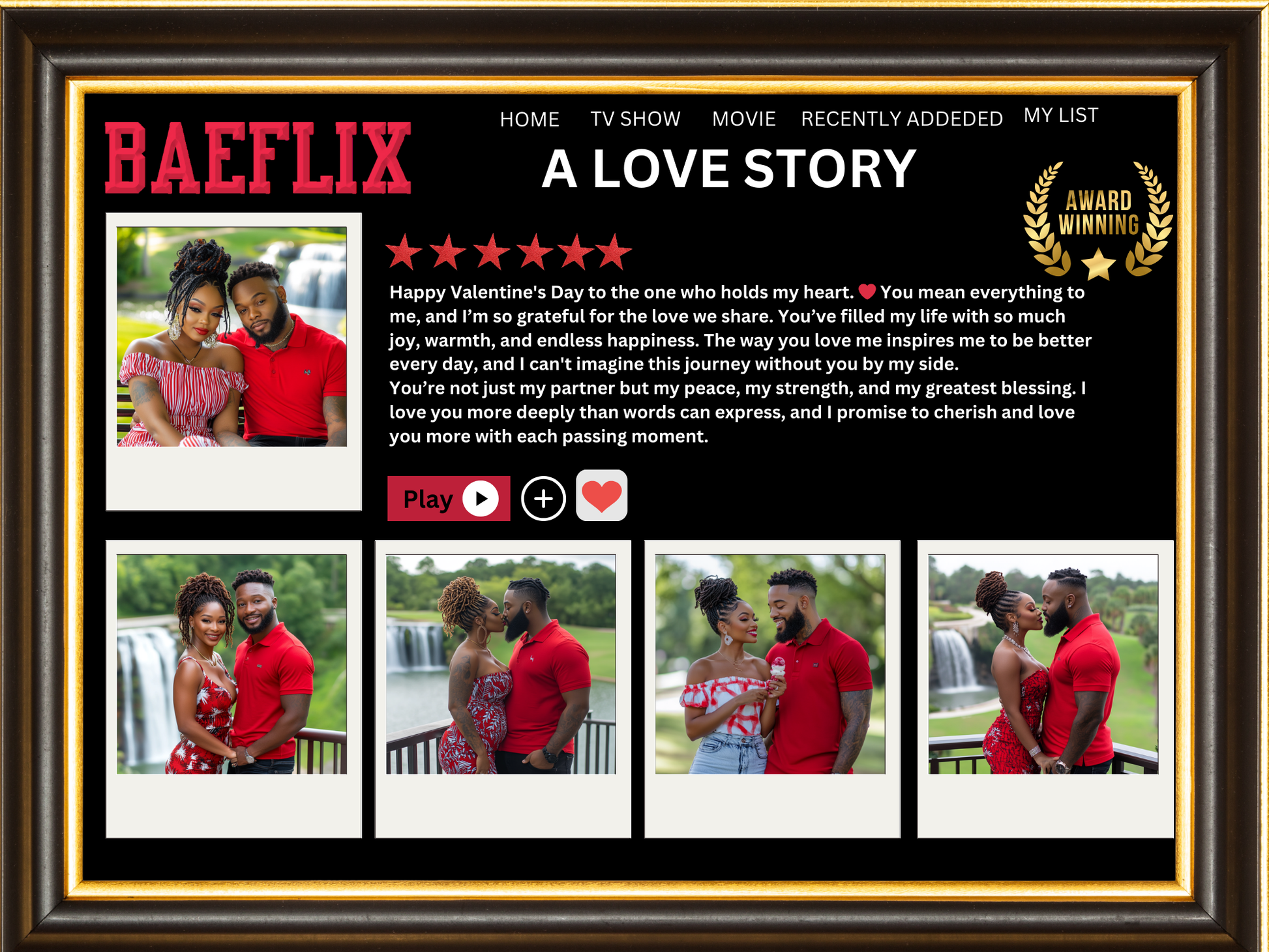 Elevate your relationship with the ultimate display of affection - the Netflix Baeflix Plaque. Showcase your love for your significant other with a sleek plaque adorned with loving pictures. Perfect for commemorating special moments and solidifying your bond.